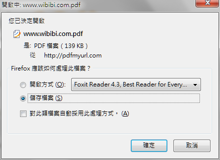 輸入完請按下轉為 PDF 並下載的按鈕,就是網址輸入框最右邊那個黃色有箭頭朝下的那顆,或者你輸入網址後直接按下 ENTER 也可以。執行 HTML 轉 PDF 的時間還蠻快的,出現下載的對話視窗囉!選擇儲存檔案,再按下確定即可。(範例使用的是 FireFox 瀏覽器)