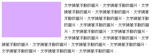 請注意,這樣的效果浮動的是淡紫色區塊,而不是文字,所以 css float 語法要用在淡紫色區塊,文字僅是因為淡紫色區塊浮動,所以才繞著他呈現,接著我們來看看 css float 的基本語法,再看看實際應用該怎麼寫。