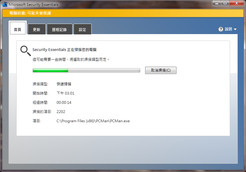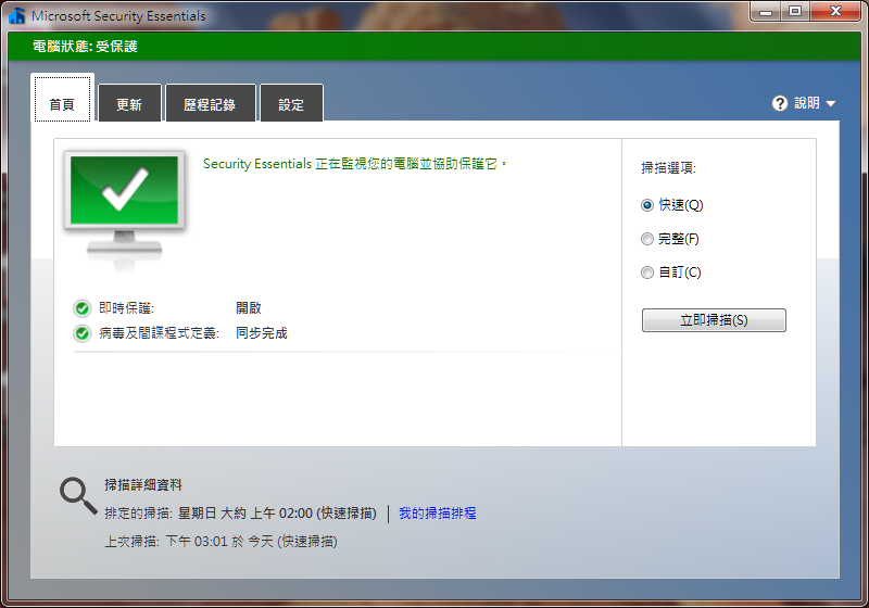 Microsoft Security Essentials 安裝好後開始掃描囉!