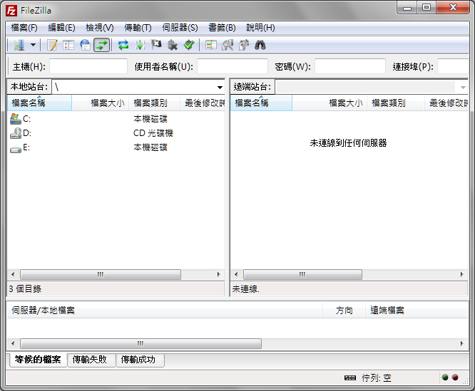 安裝好的 FileZilla client 畫面,左邊是你的電腦內容,右邊則是遠端的資料夾,只要在上方填入主機位置、使用者名稱、密碼以及連接埠再按下快速連線的按鈕就可以順利連上遠端伺服器,主機位置與帳號密碼等相關資訊則是看你的遠端伺服器設定值,連接埠有兩種,FTP 是 21,SFTP 則是 22,但通常應該都是使用 21 即可。