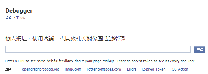 打開 Facebook Debugger 的頁面大至長成這樣,使用方式相當的簡單,就是把剛剛在塗鴉牆上分享的文章網址填入,按下"除錯"的按鈕,接著 Facebook Debugger 就會重新讀取一次那個網頁,並將結果列出來,如果該網頁並未使用 Open Graph 的標籤,Debugger 也會顯示,如果你是網站管理員,為了避免這樣的情況出現在網友使用的時候,可以參考使用:Open Graph。