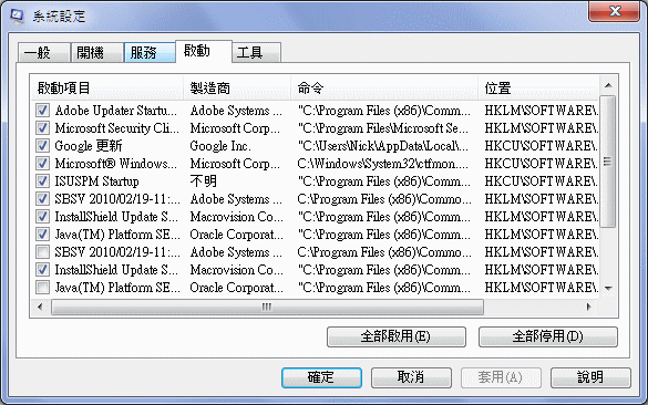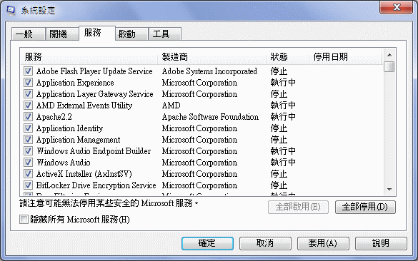 首先是要關閉開機自動啟動的程式,在系統設定的對話視窗中,可以看到許多項目,只要項目前面的核取方塊有打勾,就代表開機的時候會自動啟動,仔細的看看有哪些是不需要在開機的時候啟用的,就把勾勾取消,然後先按套用,待會兒要修改「服務」。在選擇項目的時候,請勿隨意取消項目,有些是 Windows 系統必須要用到的系統程式,例如 C:\Windows 資料夾內的通常都不應該隨意取消。