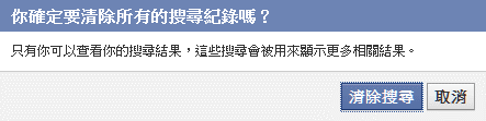 如果你在步驟二順利找到搜尋的功能選項,進去後就可以看到許多曾經使用過的搜尋記錄,有一個清除搜尋的文字,選擇後會出現詢問是否要清除所有的搜尋記錄對話視窗,選擇清除搜尋的按鈕即可完成,一瞬間所有記錄都消失囉!