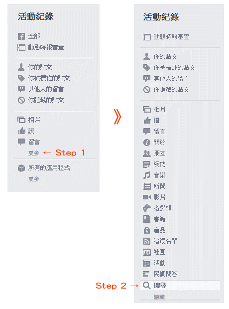 因為 Facebook 給每個人管理活動記錄的項目非常多,一開始會像下圖左方這樣只有幾個項目露出(如相片、讚、留言 ... etc),點選更多就會展開所有項目,其中有一個是"搜尋",就選擇那個項目即可。(每個人的活動記錄頁面的功能選項可能排列方式不一樣)