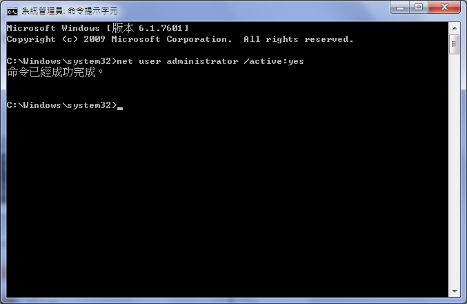 當 Windows 7 開啟這個視窗,就可以準備輸入啟用 Administrator 的指令,請輸入『net user administrator /active:yes』並按下鍵盤上的 Enter 鍵,畫面會回覆"命令已經成功完成",這時候 Administrator 就啟用完成。請注意此操作畫面上的標示為「系統管理員:命令提示字元」,與平時使用 cmd 開啟的操作畫面類似但權限不同,只有在以系統管理員身分執行的情況下,才可以啟用 Administrator 帳戶。