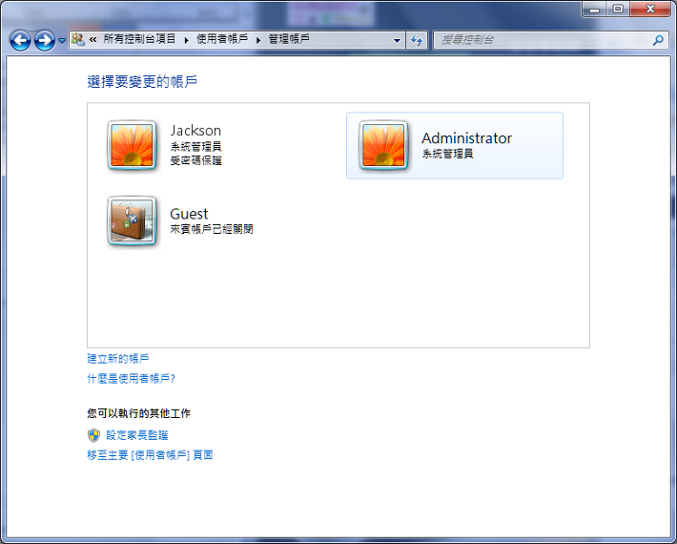 想知道是否有成功開啟系統管理員 Administrator 帳戶,可以從控制台裡面找到所有的帳戶,Administrator 如果正確開啟,理論上就能看到以下畫面所呈現的樣貌,請依照以下路徑尋找到目前作業系統上所有的帳戶。