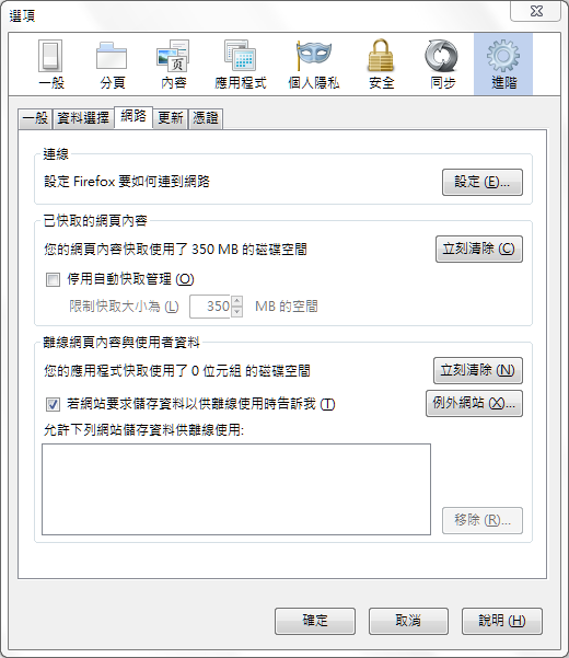 選項的對話視窗開啟後(如上圖所示),直接選擇"進階"的頁籤,又是齒輪的那個項目,接著選擇"網路"這個頁籤,就能看到其中有一個大項叫做「已快取的網頁內容」,旁邊就有立即清除的功能可以使用囉!清除 FireFox 的快取可能需要花一點點時間,這完全取決於電腦的速度以及快取的數量,如果你的快取一大堆,就只能慢慢等他清除完成。