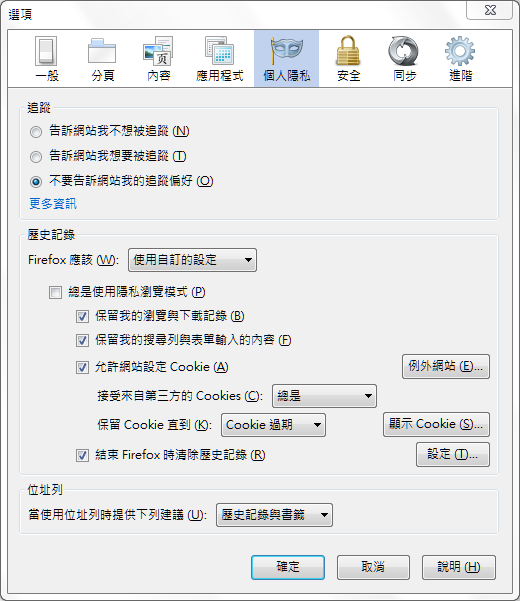 跟上面的步驟一樣,必須先開啟"選項"的對話視窗,但這次選擇"個人隱私"頁籤,裡面有一個歷史記錄的選項,將 FireFox 應該"保留所有歷史記錄"的下拉選單,改成"使用者自訂的設定",接著勾選"結束 FireFox 時清除歷史記錄",接著選擇旁邊的"設定",會額外開啟一個"歷史記錄清除設定"的對話視窗,如下圖所示。