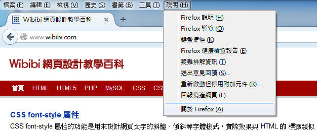 步驟一、透過鍵盤的快捷開啟選單各位的鍵盤上應該都至少會有一個 Alt 的按鍵,按一下 Alt 就可以讓 FireFox 顯示出最上端的選單,類似圖片中這樣,然後在 [說明] 的選項開啟下拉選單,可以找到一個 [關於 FireFox(A)] 的選項,就選擇那個選項。