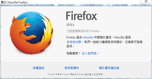 步驟二、讓 FireFox 自己告訴你版本如果你在步驟一可以順利找到選項,FireFox 就會自動跳出上圖這個對話視窗,其中就有 FireFox 的版本囉!由圖中可以看到那個 35.0.1 就是你正在使用的 FireFox 版本,目前 FireFox 會自動更新,除非你把自動更新關閉,不然通常都會是最新版本,而且更新速度還蠻快的,以上就是 FireFox 版本查詢的方式,希望對您有所幫助囉!